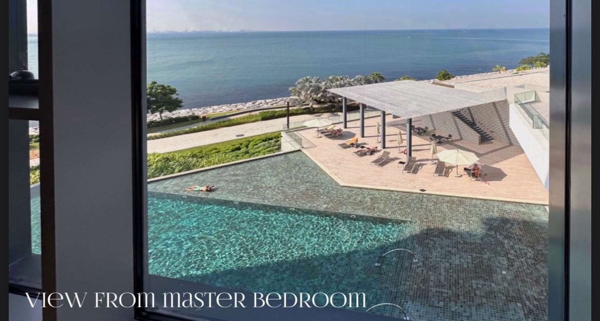 Large floor-to-ceiling windows frame uninterrupted views of the Arabian Gulf, filling the space with natural light and enhancing the open-plan living and dining areas. The spacious bedrooms offer built-in wardrobes and refined finishes, while the upgraded kitchen and bathrooms reflect contemporary luxury.